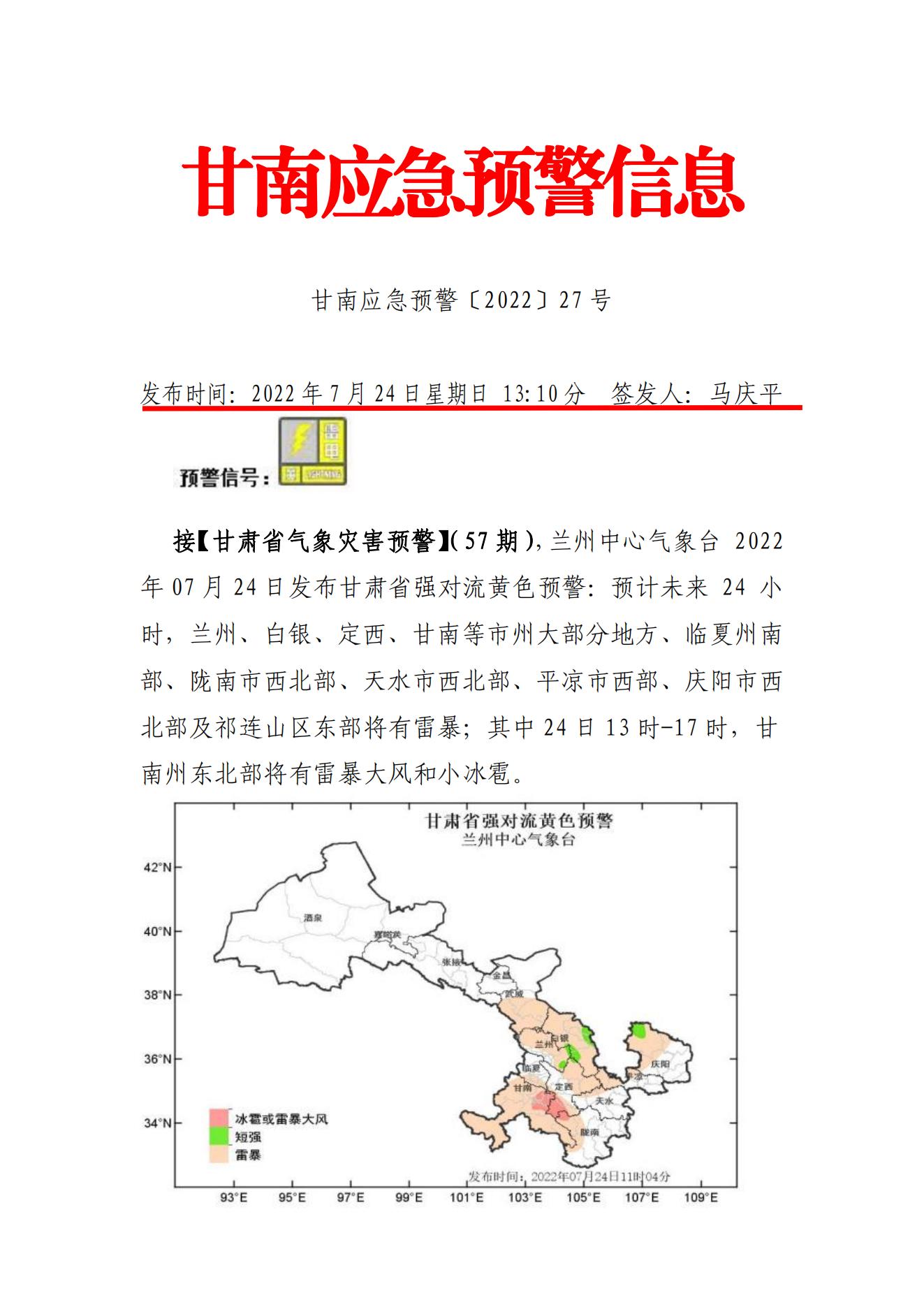 甘南应急预警信息 甘南应急预警〔2022〕27 号